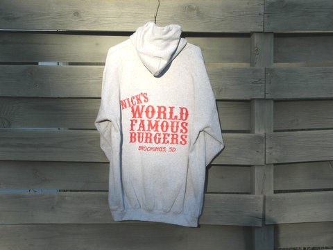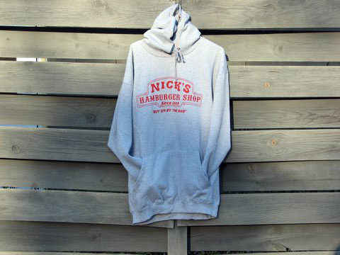 Nick's wants to keep you warm with our burgers and our hoodies! This sweatshirt is a stylish way to brave the elements so you can come have a burger. Available in gray, this hoodie is the ultimate in fashion for Nick's lovers.